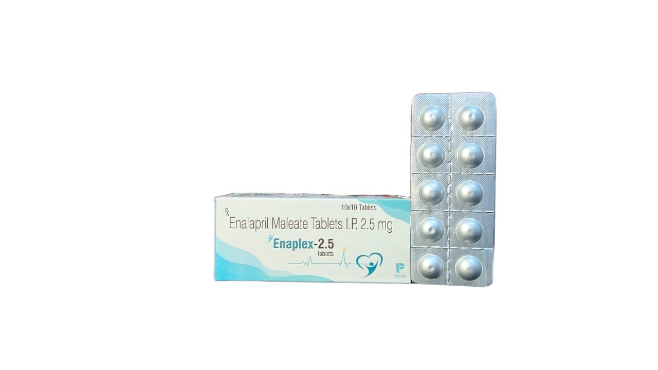 Enalapril 2.5 mg is an ACE inhibitor commonly used to treat high blood pressure (hypertension) and heart failure. It works by relaxing blood vessels, which improves blood flow, reduces the heart’s workload, and helps prevent strokes or heart attacks. It is also used to protect kidney function, especially in patients with diabetes.